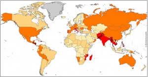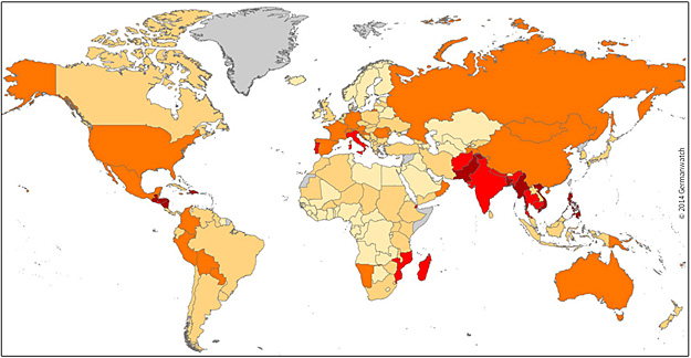 Mapa del Índice de Riesgo Climático Global, durante el periodo 1996-2015, donde cuatro de los 10 países más afectados pertenecen a América Latina y el Caribe, señalados en color granate, con Honduras encabezando el ranking. Crédito: German Watch