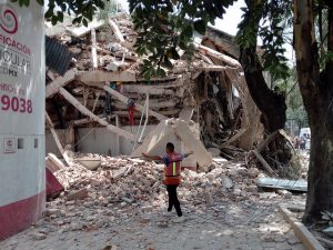 Un rescatista trata de asegurar el perímetro de un edificio caído el 19 de septiembre por el sismo de 7,1 grados, para evitar que alguno de sus antiguos residentes intente penetrar en sus ruinas, como ha sucedido en muchos de los edificios colapsados por el terremoto en Ciudad de México. Crédito: Emilio Gody/IPS
