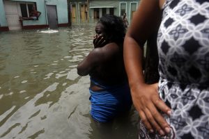 Algunas mujeres en el exterior de sus viviendas inundadas en un barrio de La Habana, por la penetración del mar que ocasionó el paso por Cuba del huracán Irma, el 9 de septiembre. El evento climático se sumó al enfriamiento de las relaciones con Estados Unidos, como un factor que perjudicó la alicaída economía del país. Crédito: Jorge Luis Baños/IPS