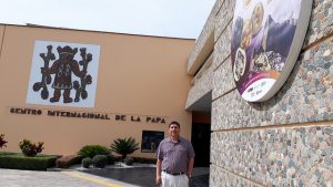 Miguel Ordinola, en el frontis de la sede en Lima del Centro Internacional de la Papa, organismo científico no gubernamental que integra el Comité Organizador del Congreso Mundial de la Papa, que acogerá la ciudad peruana de Cusco en mayo. Crédito: Mariela Jara/IPS