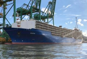 El barco Nada, fletado por la compañía Minerva Foods, en los días que estuvo atracado en el puerto del sur de Brasil, con su carga de 25.000 reses, mientras la justicia dirimía si existían condiciones para que los animales vivos fuesen exportados hasta Turquía. Crédito: Cortesía del Foro Nacional de Protección y Defensa Animal