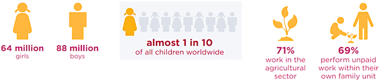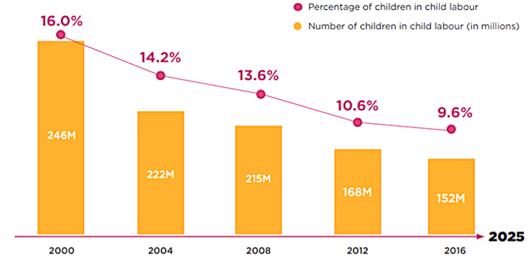La OIT (Organización Internacional del Trabajo) declaró en 2018 que en las dos últimas décadas hubo una disminución progresiva e ininterrumpida del trabajo infantil a nivel mundial (Figura 1). Sin embargo, 152 millones de niños y niñas aún se encontraban en estas condiciones (Figura 2).