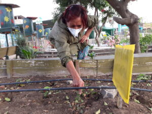 Lola Flores revisa el riego por goteo en uno de los bancales del huerto Ayllu 21, que se hace por una red de mangueras que se conecta a grandes bidones de agua. Flores destaca que las mujeres que gestionan esta iniciativa en Villa El Salvador, en Perú, contribuyen con áreas verdes para un ambiente sano. Foto: Mariela Jara / IPS