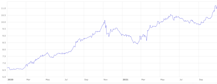 El tipo de cambio de la lira turca fue de 6,5 liras por euro y de 6 liras por dólar a principios de 2020. A finales de octubre de 2021 superó las 11 liras por euro y 9,7 liras por dólar. Se trata de una depreciación del 69% y 62%, respectivamente.