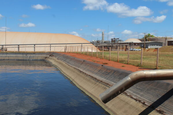 La laguna de vinaza en la planta de Cocal, en el municipio brasileño de Narandiba, que alimenta los biodigestores que producen el biogás, luego purificado y refinado para su uso en la generación de electricidad o conversión en biometano, combustible renovable y limpio, equivalente al gas natural. Foto: Mario Osava / IPS