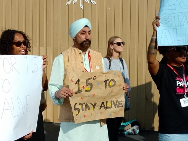 Harjeet Singh, de la Red Internacional de la Acción Climática (Climate Action Network), que reúne a más de 1800 organizaciones ambientales, durante una manifestación en el Centro de Convenciones de Sharm El Sheij. El reclamo es que se garanticen los esfuerzos necesarios para que la temperatura global no aumente más allá de 1,5 grados con respecto a los niveles preindustriales. Foto: Daniel Gutman / IPS