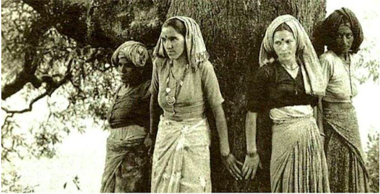 Mujeres Chipko rodeando un árbol para proteger el bosque. Imagen: Arnab Chaudhary / Wikimedia Commons