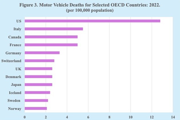 En 2022, la tasa de mortalidad por vehículos registrados fue una de las más altas del grupo. En países como Canadá, Dinamarca, Italia, Japón, Suecia y el Reino Unido, las tasas fueron menos de la mitad que la de Estados Unidos. (Imagen 3)