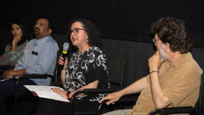 Carla García Zendejas modera un panel tras la proyección de la película “The Fisherman and the Banker (El pescador y el banquero)” en Washington, que sigue durante 10 años a la comunidad pesquera de Gujarat, en la India, que demanda a la CFI, la entidad crediticia del Banco Mundial, por financiar una central eléctrica que ha dañado la ecología de su entorno. Imagen: Ciel