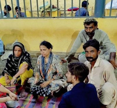 Najma (centro), Sonya (vestida de amarillo a la izquierda de Najma) y su hermano (a la derecha de Najma), cuando hacían guardia en la acera frente al centro de traumatología donde Shanti luchaba por su vida. Imagen: Seema Maheshwari