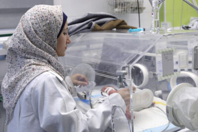 Una sanitaria atiende a un recién nacido en una incubadora de las que quedan cada vez menos funcionando en Gaza. La falta de combustible también afecta a los hospitales, donde se obtiene la electricidad mediante generadores. Imagen: MSF