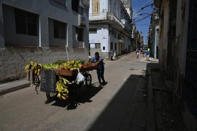Un vendedor ambulante empuja una carretilla con productos agrícolas, en La Habana. Una quinta parte de las personas ocupadas en Cuba se emplea en una ocupación informal. Imagen: Jorge Luis Baños / IPS