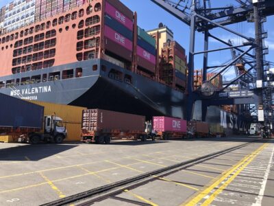 El portacontenedor Valentina, de 366 metros de eslora, atracado en el muelle 1 del puerto chileno de San Antonio en plena faena de carga. Menos de 10 minutos transcurren desde que el camión llega a un costado del buque hasta que sale del puerto habiendo entregado el contenedor. Imagen: Orlando Milesi / IPS