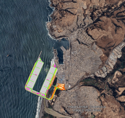 Mapa con la proyección del emplazamiento del Puerto Exterior del puerto de San Antonio, el principal de Chile, en la costa central del océano Pacífico. La ampliación casi triplicará su actual capacidad y estará plenamente operativo en 2036. Imagen: Cortesía del puerto de San Antonio