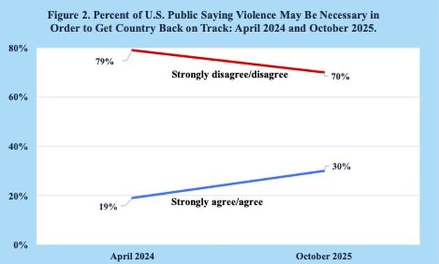 Las amenazas y la violencia son vistas cada vez más como medios aceptables para alcanzar objetivos políticos, lo que supone graves riesgos para la democracia y la sociedad. En octubre de 2025, casi un tercio de la población estadounidense, 30 %, se mostró de acuerdo o de acuerdo con la idea de que la violencia puede ser necesaria para encaminar al país nuevamente. Esta cifra representa un aumento significativo respecto de 19 % que, en abril de 2024, expresó esa misma opinión (Imagen 2).