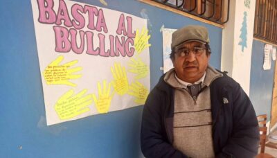 Ante un cartel contra el acoso escolar, David Acasi, coordinador de Tutoría de la escuela Eusebio Corazao, y quien considera que la reflexión sobre las nuevas masculinidades es un tema necesario en los centros educativos peruanos para fomentar relaciones de respeto con las mujeres, pero reconoce que hay resistencias a la iniciativa. Cusco es uno de los departamentos de Perú con mayor tolerancia a la violencia de género. Imagen: Mariela Jara / IPS