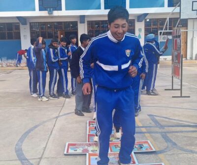 En el patio de la escuela Eusebio Corazao, en el municipio rural peruano de Lamay, adolescentes varones juegan divertidos a la rayuela, generalmente considerado un juego de niñas y conocido como Mundo en Perú. En cada casilla hay frases a favor de la igualdad, en el hogar y otros ámbitos, como parte de su adiestramiento en liberarse de masculinidades negativas y de conductas machistas. Imagen: Mariela Jara / IPS