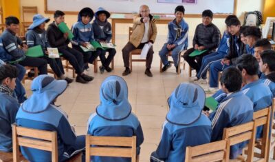 El psicólogo e integrante de la Red de Nuevas Masculinidades del departamento peruano de Cusco, Julio Lazo, en diálogo con alumnos de secundaria de la institución educativa rural Chumpe Poques, sobre las diferentes formas de expresión del machismo a partir de sus propias vivencias, tras vencer sus iniciales resistencias frente al tema. Imagen: Mariela Jara / IPS