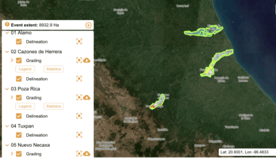 Imagen satelital que muestra la zona de 111 municipios afectados por lluvias torrenciales e inundaciones en cinco estados de México. Imagen: Copernicus EMS