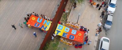 Habitantes de Aguaprieta (México) y Douglas (Estados Unidos) sostienen, la mitad de cada lado, una pancarta «Unidos» a través de los barrotes del muro que divide ambos países. Actividades culturales y comunitarias compartidas subrayan la búsqueda de que la frontera sea una zona de oportunidad y esperanza antes que de temor y divisiones. Imagen:FdC