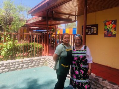 Virginia Milla Gómez, directora del jardín infantil y sala cuna Taiñ Folil, y María Eugenia Cañumir, educadora mapuche del proyecto nido lingüístico, en el patio interior del centro en una soleada mañana de primavera en uno de los municipios de la periferia de Santiago de Chile. Imagen: Orlando Milesi / IPS