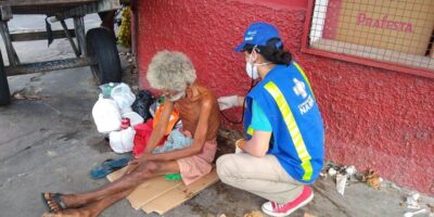 El médico Fabrico Brazão asistiendo a una persona que vivía en la calle, con tuberculosis, una enfermedad frecuente entre pobladores en situación de calle en Belém. El calor no aumenta el contagio por el bacilo de la tuberculosis, pero debilita el enfermo. Imagen: Cortesía de Fabrico Brazão