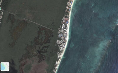 Imágenes satelitales que muestran el avance de complejos hoteleros en la costa de Puerto Morelos, en el sudoriental estado de Quintana Roo, y su consiguiente impacto ambiental. Esas edificaciones interrumpen flujos de agua vitales para los entornos terrestre y marino y que pueden provocar inundaciones. Imagen: Google Earth