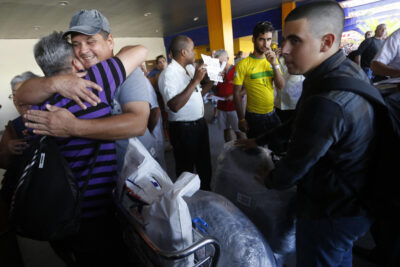 Dos hombres se abrazan tras la llegada de un vuelo comercial proveniente de la ciudad estadounidense de Miami, en la Terminal 2 del Aeropuerto internacional José Martí, en La Habana. La circularidad migratoria puede entenderse como “la alternativa a defender los vínculos de Cuba con sus nacionales, con independencia del lugar donde residan”. Imagen: Jorge Luis Baños / IPS