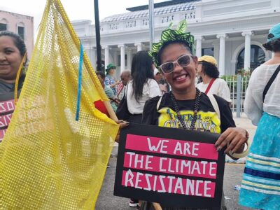 “Somos la resistencia al clima”, es la traducción de un cartel en inglés una joven, durante marcha del sábado 15, celebrada en Belém, en el marco de la COP30, bajo el lema: Desde el Amazonas para el mundo: Fin de la desigualdad y del racismo ambiental. Justicia climática ya. Imagen: Mariela Jara / IPS