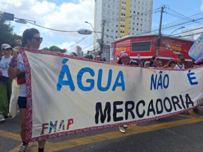 “El agua no es mercancía”, dice en portugués una de las cientos de pancartas exhibidas durante la marcha, el sábado 15, de la Cumbre de los Pueblos hacia la sede de la COP30, que acoge la ciudad de Belém, en la Amazonia brasileña. Imagen: Mariela Jara / IPS