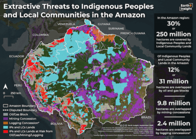 Mapa que destaca las amenazas extractivas a las que se enfrentan los pueblos indígenas y las comunidades locales en toda la cuenca del Amazonas. Imagen: AGCT