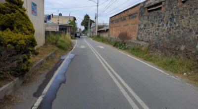 Una calle residencial del municipio de San Miguel Ajusco, en el sur de Ciudad de México y donde es visible una fuga de agua. Muchos de sus residentes reciben agua potable mediante camiones aljibe, llamados localmente pipas, cuyo costo es cuantioso, cuando no se los suministra la alcaldía. Imagen: Emilio Godoy / IPS