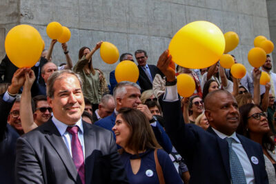 Un grupo de abogados protesta en São Paulo contra una decisión del juez Gilmar Mendes, decano del Supremo Tribunal Federal y autor de controvertidos fallos, como el que restringió al Procurador General (fiscal general) la prerrogativa de pedir la inhabilitación de los 11 miembros del máximo tribunal. El magistrado debió retirar su dictamen y se mantiene que cualquier ciudadano pueda hacerlo. Imagen: Cadu Pinotti / Agência Brasil