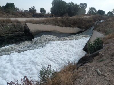 Canal de aguas domésticas e industriales en las inmediaciones del polígono del proyectado parque de economía circular en Tula, en el estado de Hidalgo, zona muy contaminada por actividades industriales. Imagen: Emilio Godoy / IPS