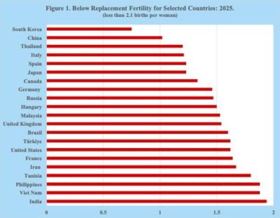 Imagen 1. Fecundidad por debajo del nivel de reemplazo en países seleccionados: 2025 (menos de 2,1 nacimientos por mujer). Fuente: Naciones Unidas