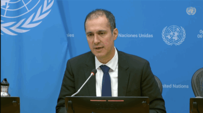 El profesor Kaveh Madani, director del Instituto para el Agua, el Medio Ambiente y la Salud de la Universidad de las Naciones Unidas, participa en la rueda de prensa en que se dio a conocer el informe. Imagen: IPS