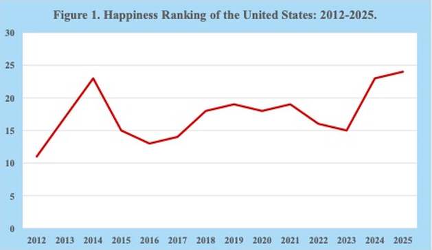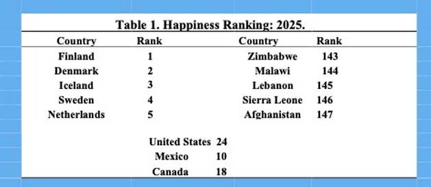 Según el Informe Mundial de la Felicidad 2025, elaborado por Gallup, Estados Unidos se ubicó en el puesto 24 entre 147 países, lo que marcó su posición más baja hasta la fecha (Tabla 1).