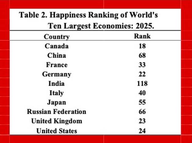 Las posiciones en el ranking de felicidad varían de manera significativa entre las economías más grandes del mundo. Entre los 10 países con las economías de mayor tamaño, Canadá ocupó la mejor posición en 2025, con el puesto 18, seguido por Alemania en el 22, Reino Unido en el 23 y Estados Unidos en el 24 (Tabla 2).