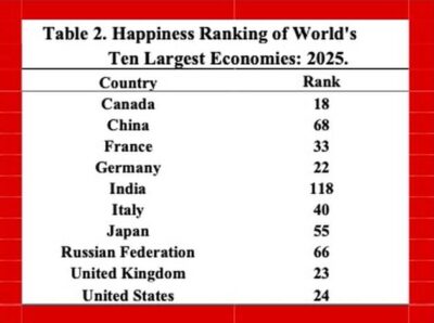 Tabla 2. Clasificación de felicidad de las 10 economías más grandes del mundo: 2025. Fuente: Informe Mundial de la Felicidad 2025