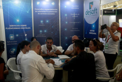 Estand de la Empresa Nacional de Software Desoft, durante la feria internacional de La Habana, Fihav 2023. La Ley General de Ciencia, Tecnología e Innovación busca fomentar la interacción entre el sector empresarial y el académico. Imagen: Jorge Luis Baños / IPS