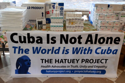 “Cuba no está sola”, reza una pancarta en inglés que acompaña donativos de medicamentos destinados a niños con cáncer en Cuba, gestionados por el estadounidense Proyecto Hatuey, en La Habana. Varios países han anunciado envíos de ayuda humanitaria a Cuba, tras el bloqueo de combustible impuesto por Estados Unidos. Imagen: Jorge Luis Baños / IPS