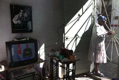 Una mujer mira por la puerta enrejada de su vivienda mientras escucha la transmisión de la alocución del presidente cubano Miguel-Díaz Canel, el 5 de febrero, en televisión nacional, en La Habana. Imagen: Jorge Luis Baños / IPS
