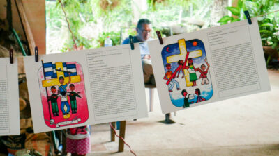 En septiembre de 2024, decenas de familiares de personas capturadas, se reunieron en Tierra Blanca, un distrito del este de Salvador, en la región del Bajo Lempa, para demandar justicia en el caso de sus parientes, a los que consideran inocentes. Ahí se presentaron acuarelas en la muestra El Viacrucis del Régimen de Excepción. Imagen: Edgardo Ayala / IPS