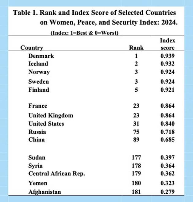 Los cinco países con mejor desempeño en ese índice son Dinamarca, Islandia, Noruega, Suecia y Finlandia. En conjunto, estos cinco países representan aproximadamente 0,3 % de la población femenina mundial. Los países europeos ocupan nueve de los diez primeros puestos y los países nórdicos se mantienen entre los diez primeros desde hace años.