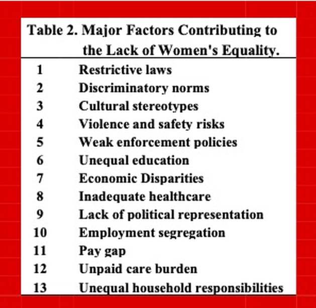 Diversos factores contribuyen a la falta de igualdad y a la discriminación contra mujeres y niñas. Entre ellos se destacan leyes restrictivas, normas discriminatorias, estereotipos culturales, riesgos de violencia y desigualdades educativas que valoran más a hombres y niños. Estas barreras misóginas se refuerzan por sesgos inconscientes, débil aplicación de políticas, disparidades económicas y desventajas estructurales (Tabla 2).