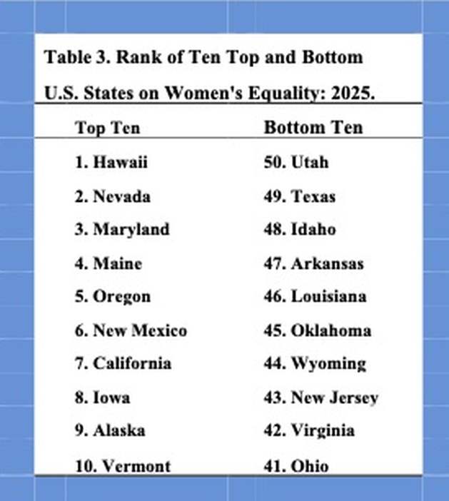 La desigualdad de género también varía dentro de los países. Por ejemplo, aunque las mujeres representan 50 % de la población de Estados Unidos, la desigualdad persiste en los ámbitos social, económico y político. Según 17 indicadores clave, los cinco estados con mejores resultados son Hawái, Nevada, Maryland, Maine y Oregón, mientras que los cinco con peores resultados son Utah, Texas, Idaho, Arkansas y Luisiana (Tabla 3).