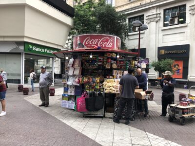 Un quiosco en el céntrico paseo Ahumada, en Santiago de Chile. Los diarios y revistas que ofrecen parecen escondidos y apenas se vislumbran detrás de chocolates, calendarios, bolsos, muñecos, bebidas y otros productos con mayor demanda en la actualidad. Imagen: Orlando Milesi / IPS