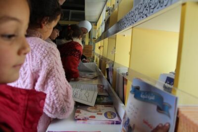 Niños desplazados eligen sus historias favoritas dentro del autobús cultural en el campamento de Al Azraq, en el norte de Siria. Imagen: Sonia al Ali / IPS