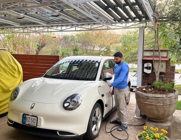 El vehículo eléctrico blanco del paquistaní Vaqar Zakaria se carga bajo paneles solares en el techo de su casa, alimentado por el sol. Imagen: Cortesía de Vaqar Zakaria