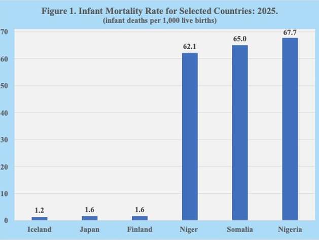 Desde el primer año de vida, se hacen evidentes diferencias significativas en la probabilidad de muerte entre las poblaciones humanas. Países como Islandia, Japón y Finlandia presentan algunas de las tasas de mortalidad infantil más bajas, con menos de dos muertes infantiles por cada 1000 nacidos vivos. En contraste, naciones como Níger, Somalia y Nigeria presentan algunas de las tasas más altas, con más de 62 muertes infantiles por cada 1000 nacidos vivos, lo que representa 30 veces más que las tasas más bajas (Gráfico 1).